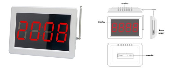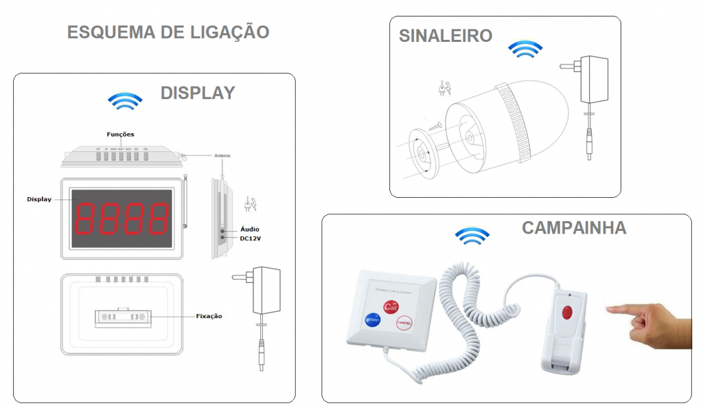 O sistema é composto por uma campainha de três botões + pera, painel display numérico e como opcional o pager de pulso e repetidora. Seu funcionamento é simples e eficaz. O sistema sem fio adota a mais recente tecnologia de RF e identificação digital, o que torna os produtos estáveis e de alto desempenho.