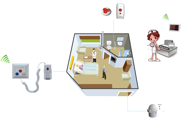 O sistema de chamadas sem fio é amplamente utilizado para melhorar a eficiência do trabalho. Pode ser utilizado pela enfermeira, ou pela chefe de enfermagem para monitoramento do local, ou para atendimento das chamadas.